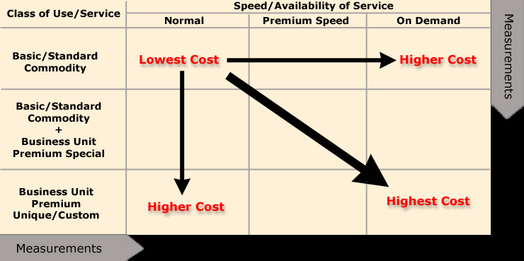 This approach allows business units and corporate departments to share in basic, standard, commodity-type services at the same unit cost, the driver being either the number of users or the volume of use by class of use or service. Business units requiring higher levels of more specialized services and/or faster speed or greater availability can identify the premium services they want from the It organization "by the pound" in increments above the standard services.